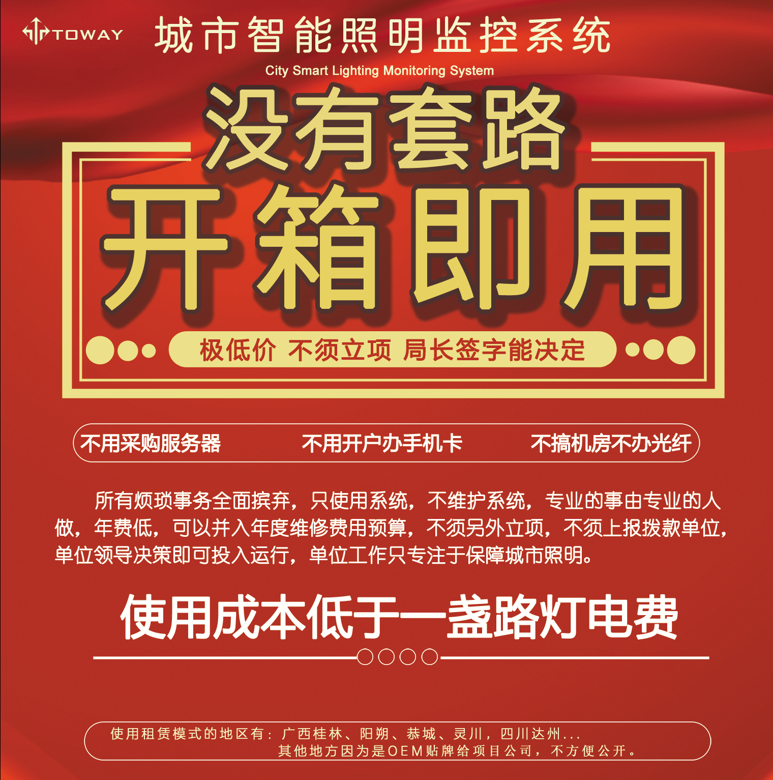 此方案對(duì)于一個(gè)縣城100臺(tái)路燈配電箱的體量,首年開支也只有三萬五千元,此后每年費(fèi)用是兩萬五,本方案最大的優(yōu)點(diǎn)就是費(fèi)用低廉,這筆費(fèi)用完全可以并入年度維護(hù)撥款中核銷。且不會(huì)有設(shè)備過保要重新采購(gòu)的問題出現(xiàn)。